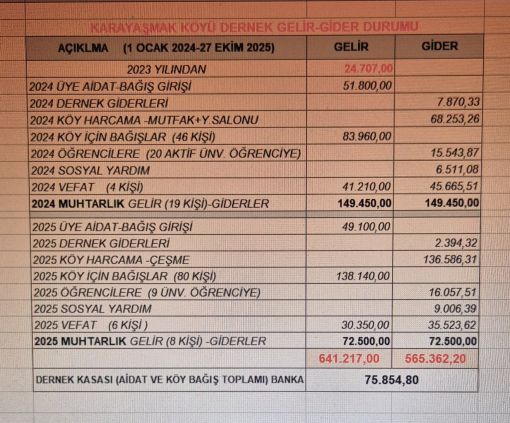 Derneğimizin 2024-25 muhasebesi... KARAYAŞMAK KÖYÜ DERNEĞİMİZ ( 01 OCAK 2024 -27 EKİM 2025 MUHASEBEMİZ ) Kıymetli köylülerim, bildiğiniz üzere Derneğimizin kuruluşundan bugüne birlikte gücümüz yettiği kadar hem İstanbulda, hemde Karayaşmak köyümüzde işler yaptık ve yapmaya gayret ediyoruz. Son iki yılda üye aidat tutarı 200 TL belirleyip aidiyet duygusunu artırmaya sayımızı çoğaltmaya çalıştık. Hamd olsun komşularımızın duyarlı davranışları bizleri mutlu etmektedir.