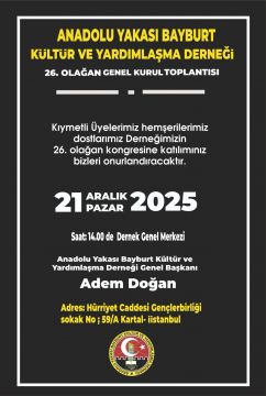 Adem Doğan Başkan...![]() GENEL KURUL DAVETİ Köyümüzden Sn Adem Doğan beyin Başkanı olduğu, Anadolu Yakası Bayburt Kültür ve Yardımlaşma Derneğimizin 26. Olağan Genel Kurul toplantısına davetliyiz. Tarih : 21 Aralık 2025 Pazar Saat : 14:00 Adres: Kartal Merkez Gençlerbirliği Sk Yer. : Dernek Lokali Müsait olan komşu ve arkadaşların bu STK Genel Kurul ve muhabbet birliğine katılımlarından mutluluk duyarız. Erol Atasoy Dernek Başkanı |