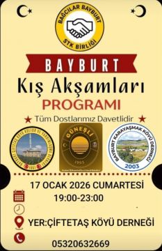 Muhabbet...![]() BAYBURT KIŞ AKŞAMLARI Muhabbet programımız var. Bağcılar Bayburt STK Birliği etkinlik kapsamında; Çiftetaş (Hardışı), Güneşli (Yanbastı) ve Karayaşmak Köyü Dernek yönetimleri olarak ortak düzenlediğimiz "Bayburt Kış Akşamları" programımızda; Davul-Zurna ile Bayburt Barları, Bayburtlu Sanatçımız Sezai Seçen ile sıla türkülerimiz, Damak tadımız herse, çörek, tel helvası, tatlı ikramlarıyla muhabbet akşamına tüm komşu ve dostlarımızı bekliyoruz. Tarih: 17 Ocak 2026 Cumartesi Saat: 19:00-23:00 Çiftetaş Derneği Bağcılar Yıldıztepe Mah 517. Sokak (Parseller Malta ışıklar 3.sokak) İlyas Çavuşoğlu Güven Altuntaş Erol Atasoy Çiftetaş Dernek Bşk. Güneşli Dernek Bşk. Karayaşmak Dernek Bşk. |